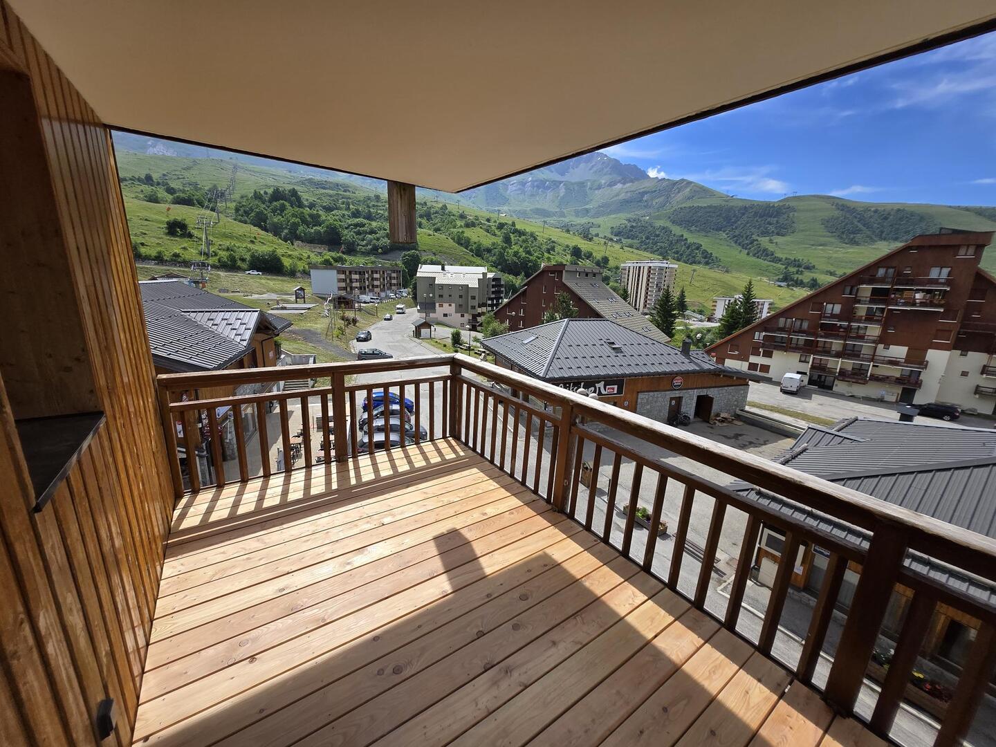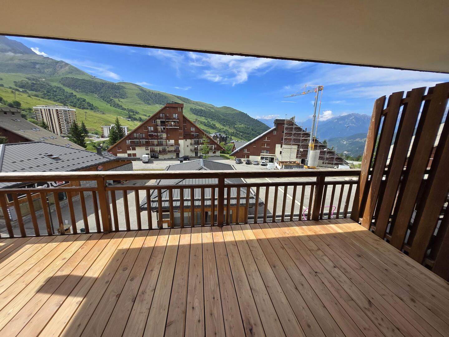 L’appartement est plein sud, avec une terrasse de 12 m² offrant une vue imprenable sur les remontées, la station et les montagnes environnantes.